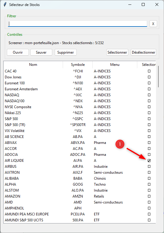 - (1) Indique simplement que l'action Air Liquide est sélectionnée dans le screener mon-portefeuille.json
