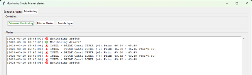 Le Monitor Stock Market recalcule, à chaque tour, les projections des droites du canal pour alerter si le cours s'approche touche le canal en Haut ou en Bas ou si le cours le cours casse le canal en Haut ou en Bas.