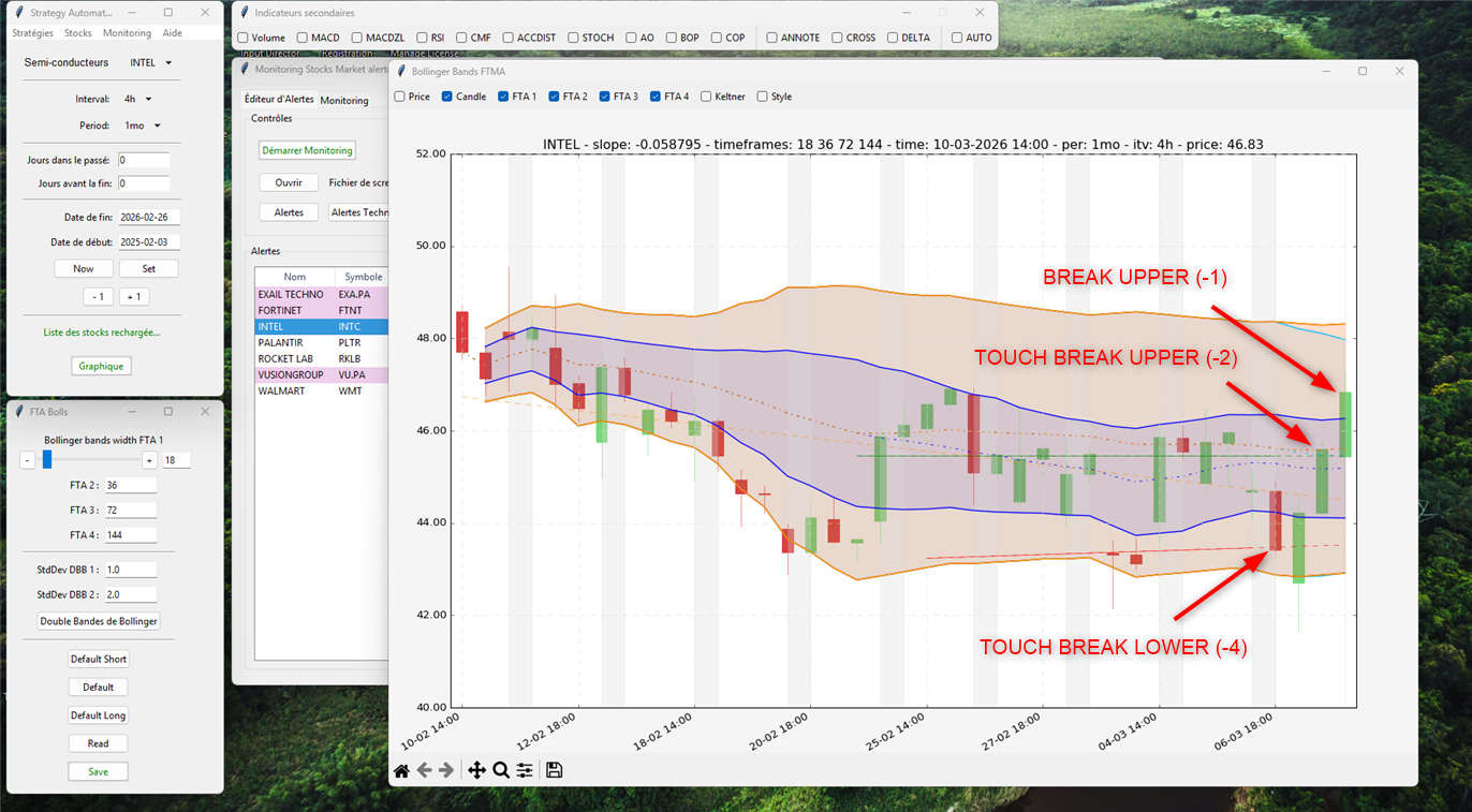 Sur la stratégie de trading technique Bollinger Bands FTMA vous allez tracer un canal d'alertes.