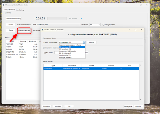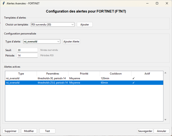Dans le Monitor Stock Market Alertes, je vais pouvoir positionner une alerte RSI survendu (30) pour surveiller la stock FORTINET et déclencher une alerte lorsque le calcul de son RSI donne un résultat < 30 :