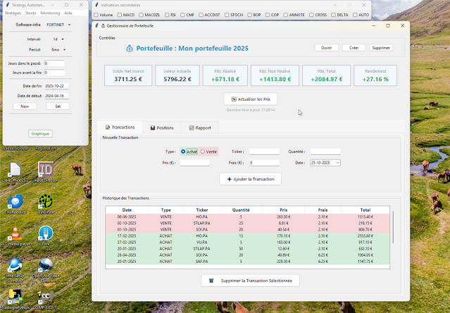 Le Gestionnaire de Portefeuilles, vous permet de consolider votre trading par la gestion rigoureuse de tous vos actes d'achats/ventes dans un Portefeuille qui centralise tous vos achats, vos ventes et calcule l'efficacité de vos trades.