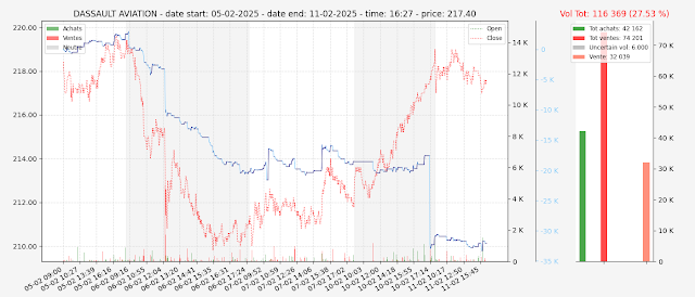 Vous pouvez voir que le cours en rouge est très différent de l'intégrale des flux. Pour DASSAULT AVIATION le prix monte alors que la pression de vente est de 27,53 %.