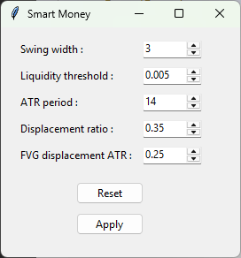 Voici les paramètres de la Smart Money, ils permettent d'ajuster la finesse des concepts de l'ICT :